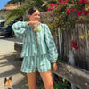 The coordinating striped shorts seamlessly complement the top, creating a harmonious, unified outfit.