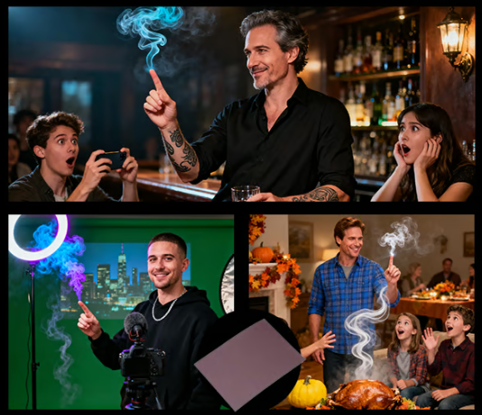 Step 3 — Amaze: Gently rub your fingertips together and watch as mysterious smoke rises, leaving everyone completely baffled.