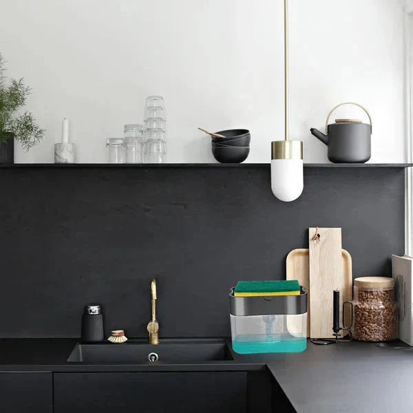 A dish soap dispenser that offers compact storage for soap and a sponge, keeping your sink area clutter-free.